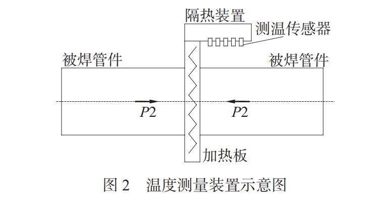 試驗所用焊接裝置采用自主設(shè)計的手動 PE管道熱熔焊接機(jī),其試驗裝置如圖 1 所示,可實現(xiàn)焊接過程中加熱溫度、焊接位移、焊接壓力等參數(shù)信息的實時顯示。設(shè)備通過曲柄滑塊機(jī)構(gòu)傳遞焊接過程所需壓力,壓力傳感器 1 安裝在夾持導(dǎo)向裝置上,監(jiān)測焊接過程所施壓力;壓力傳感器 2 安裝在加熱板水平兩端,可對加熱壓力進(jìn)行顯示;位移測量裝置與夾具連接,根據(jù)夾具移動量可獲取管道在對接時擠出的熔融層厚度;溫度測量裝置安裝在加熱板頂部,實時監(jiān)測管道焊接區(qū)域的溫度。紅外探頭采用交錯式布置,點位分布如圖 2 所示,探頭沿軸向分別為距離加熱板端面 8.2,10.2,12.2,24.2,35.2 mm。