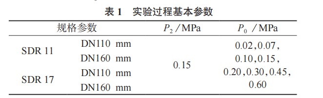 焊接試驗環(huán)境控制室內(nèi)溫度為 27℃,空氣無流動,選取焊接工藝溫度為 215℃。根據(jù) HG/T 4281–2011 塑料焊接工藝規(guī)程制備熱熔焊接接頭。接頭性能對溶膠壓力要求不高 [9–10],根據(jù)試驗所用手動式焊接裝置施壓機(jī)構(gòu)的自鎖特點,施加一定溶膠壓力后,材料受熱熔化擠出,但夾具不因壓力的變化而移動,設(shè)備自行泄壓,可實現(xiàn)處理端面不平整目的,使熔化的塑料在微弱壓力下充分流動。因此試驗省去加熱階段人為泄壓一環(huán),對各規(guī)格管道施加相同溶膠壓力,采用材料熔化泄壓的方式對管道進(jìn)行加熱。再通過改變焊件對接時的焊接壓力,保證其余工藝參數(shù)不變的條件下進(jìn)行試驗,利用位移測量裝置獲取管道在對接時擠出的熔融段長度,得出不同焊接壓力下,熔融層的擠出厚度值 ( 即焊接位移值 )。相關(guān)參數(shù)設(shè)置見表 1,表中溶膠壓力(P2)與焊接壓力(P0)均為焊件截面壓強(qiáng)。