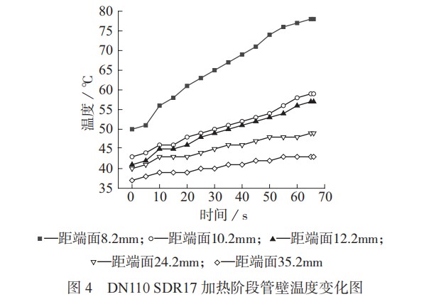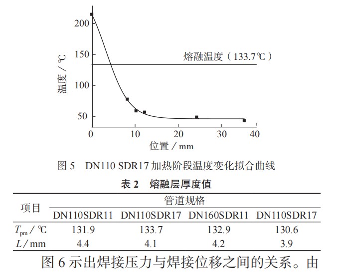 通過溫度測量裝置,測得加熱階段各場點的溫度實時變化過程。圖 4 為加熱階段管壁溫度變化圖。對加熱結(jié)束時的場點溫度進(jìn)行數(shù)據(jù)擬合,結(jié)果如圖 5 所示,管道不同場點溫度在加熱階段呈現(xiàn)出近似線性增長的趨勢。研究過程中利用德國耐馳公司生產(chǎn)的 DSC200F3 型分析儀對試驗材料進(jìn)行了差示掃描量熱 (DSC) 法試驗,獲取了材料確切的物理性能。測試條件為:樣品 (6.4±0.1) mg ;升溫速度10℃/min ;氮?dú)饬髁?50 mL/min ;加熱溫度 20~300℃。結(jié)合 4 種管材溫度場和 DSC 試驗結(jié)果,以熔融溫度 (Tpm) 為界限,得出熔融層厚度值 (L),見表 2。因管道屬性不同,各管道實際 L 也有所不同,進(jìn)一步證明傳統(tǒng)工藝下的接頭焊接質(zhì)量,受客觀因素影響較大,環(huán)境或者材料屬性的變化,可能導(dǎo)致管件 L 無法達(dá)到熱熔對接的要求。