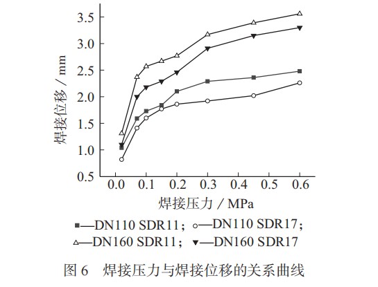圖 6 可見,同種管道下的焊接位移隨焊接壓力的增大而增大,在增長速率上,PE 屬于線性非晶態(tài)共聚物,加熱后的管道存在 3 種不同聚集狀態(tài),分別為玻璃態(tài)、橡膠態(tài)和熔融態(tài) ,管材的彈性系數(shù)與抗形變能力隨溫度的降低而增大,因此焊接位移變化速率隨焊接壓力的增大而減小。
