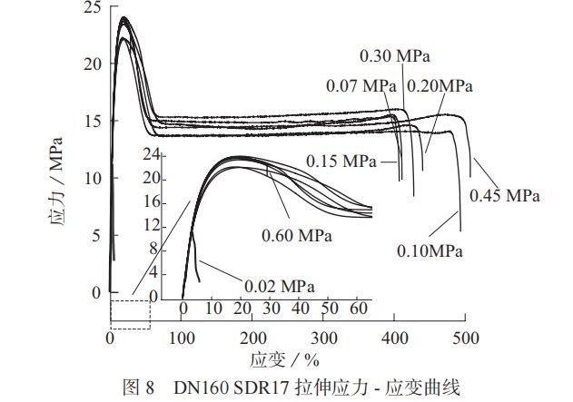 主要考察試樣拉伸強(qiáng)度、斷裂伸長率、斷口位置及斷裂方式,以此作為評價熱熔焊接試驗接頭性能的依據(jù)。以 DN160 SDR17 為例,不同焊接壓力下的拉伸應(yīng)力 – 應(yīng)變曲線見圖 8。通過 4 種規(guī)格管材在拉伸試驗結(jié)果對比分析,整體上可將各試樣拉伸應(yīng)力 - 應(yīng)變曲線分為 3 種形式,以下分別分析。