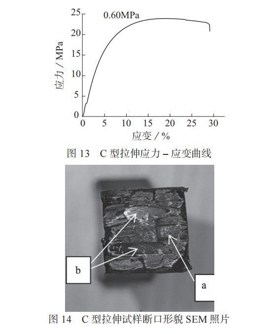 第三種 C 型拉伸應(yīng)力 – 應(yīng)變曲線如圖 13 所示。主要存在于焊接壓力過大的管道焊接接頭。管道在焊接壓力為 0.60 MPa 下的接頭試樣拉伸試驗結(jié)果。試樣斷口形貌的 SEM 照片如圖 14 所示。斷面宏觀上呈現(xiàn)大面積白色銀紋區(qū)域 ( 圖 14 中 a 區(qū)域 ),中部光滑區(qū)域 ( 圖 14 中 b 區(qū)域 ) 出現(xiàn)解理斷裂現(xiàn)象,此現(xiàn)象為典型的脆斷特征。在此工況下出現(xiàn)拉伸脆斷原因:過高的焊接壓力致使接頭處溶膠被大量擠出,剩余焊接面熔融物不足以滿足強(qiáng)度要求,加之管道熔融冷卻過程等同于對管材進(jìn)行了退火處理,使熔融區(qū)內(nèi)晶粒進(jìn)行再結(jié)晶,提高管材結(jié)晶度,同時導(dǎo)致韌性下降,因此當(dāng)拉伸應(yīng)力到一定程度后,試樣在尚未表現(xiàn)出明顯形變的情況下,在焊縫處直接脆斷。
