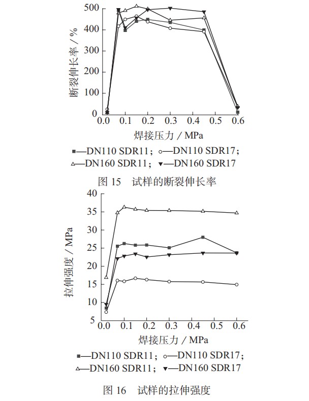 以圖 15、圖 16 示出。從圖中所示數(shù)據(jù)以及對試驗過程的觀察發(fā)現(xiàn),焊接壓力在 0.07~0.45 MPa 內(nèi)的試樣,其斷裂伸長率基本達(dá)到 400% 以上,斷裂形式為基材拉伸 – 基材斷裂,斷裂方式為韌性斷裂。