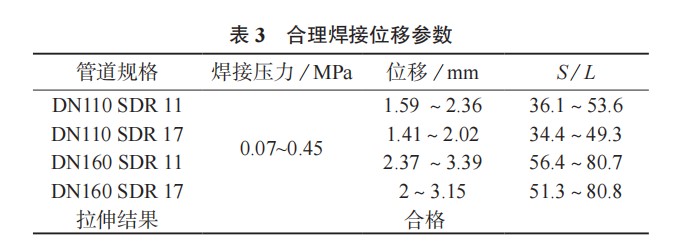 根據(jù) GB/T 19810–2005 評價標(biāo)準(zhǔn)做出結(jié)論,在0.07~0.45 MPa 焊接壓力區(qū)間內(nèi)所制備的熱熔焊接頭,其性能可滿足標(biāo)準(zhǔn)要求。與焊接壓力相對應(yīng)的焊接位移區(qū)間和 S/L 值區(qū)間由表 3 統(tǒng)計看出,通過控制位移參數(shù),達(dá)到一定范圍內(nèi)的 S/L 值可以得到合格的管道熱熔焊接頭。DN110 SDR 11 管道的合格 S/L 值區(qū)間為 36.1%~53.6%,DN110 SDR 17為 34.4%~49.3%,DN160 SDR 11 為 56.4%~80.7%,DN160 SDR 17 為 51.3%~80.8% 。