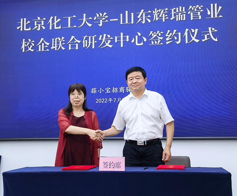簽訂成立“北京化工大學-山東輝瑞管業(yè)校企聯(lián)合研發(fā)中心”協(xié)議,簽約人:馬秀清、侯成安
